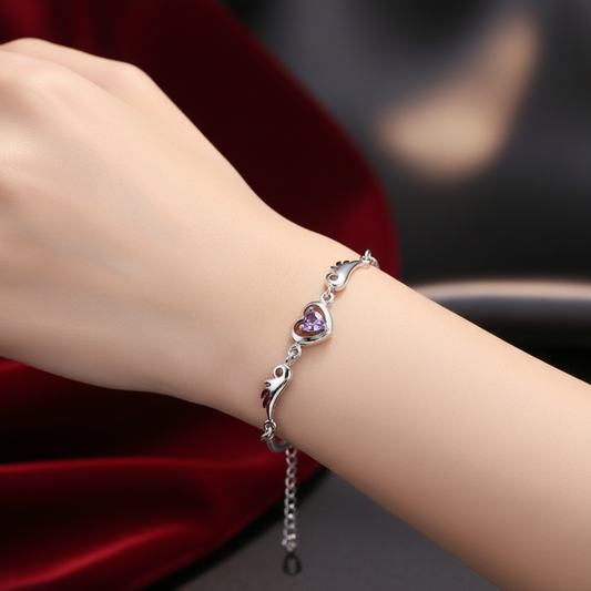 S925 Sterling Silber Armband mit Doppelherz & Amethyst